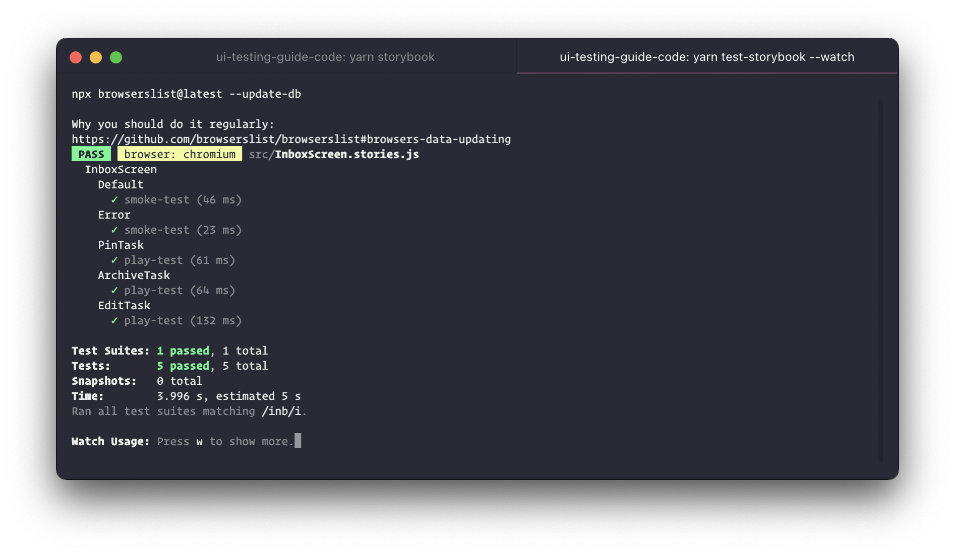 In the previous chapter, we catalogued all the use cases of the InboxScreen component in the InboxScreen.stories.jsx file. That allowed us to spot-check appearance during development and catch regressions via visual tests. These stories will now also power our component tests.
